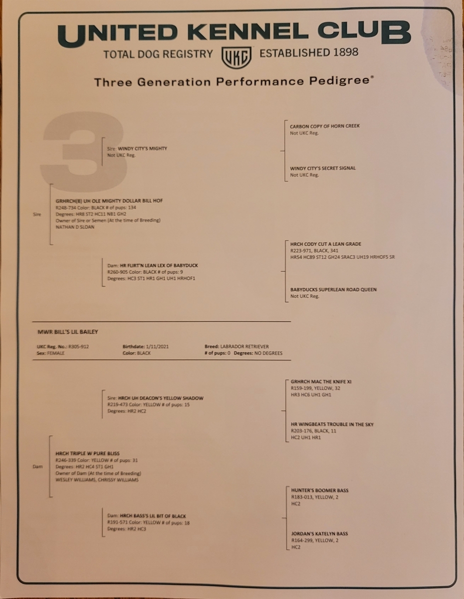 Bailey has a great loyal personality. She is energetic and has a natural retrieving instict. She earned her HR title September 18, 2022. Bailey is the daughter of 8xGRHRCH UH Mighty Dollar Bill HOF. Her offspring should make great competition/hunting or family companions