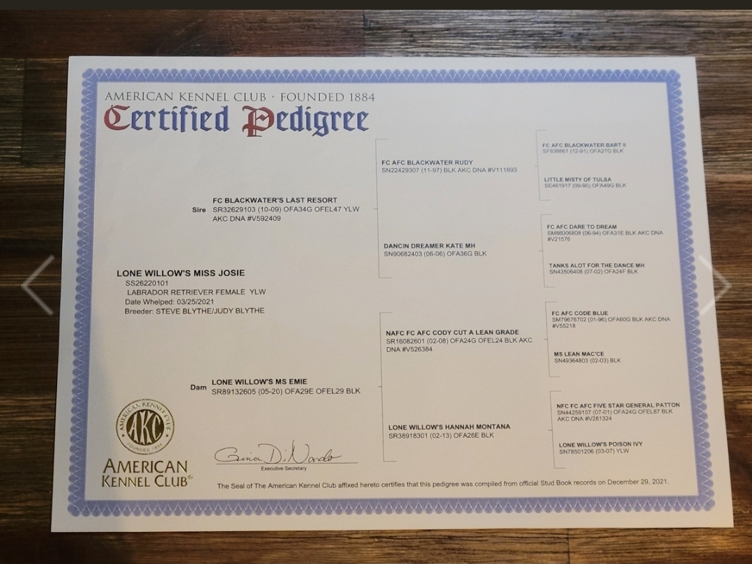 Josie is out of a nice Field Trial Pedigree and NAFC FC AFC Cody Cut A Lean Grade. She is a stong athletic yellow female with a eager natural retrieving drive. Loyall personality that's loves attention.