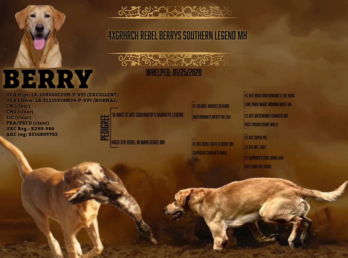 Berry is a well accomplished yellow stud with outstanding pedigree. He has earned his Grand Hunting Retriever Champion Title Six times now and he is in the Hall of Fame. He is a beautiful dog with and high natural abilities. He came Southern Flight Retriever as a puppy. His mother is HRCH Rebel In My Genes call name Maya. Sire is NAFC Coolwaters Legend. He is owned by Michael May. Contact Michael for any breeding needs.