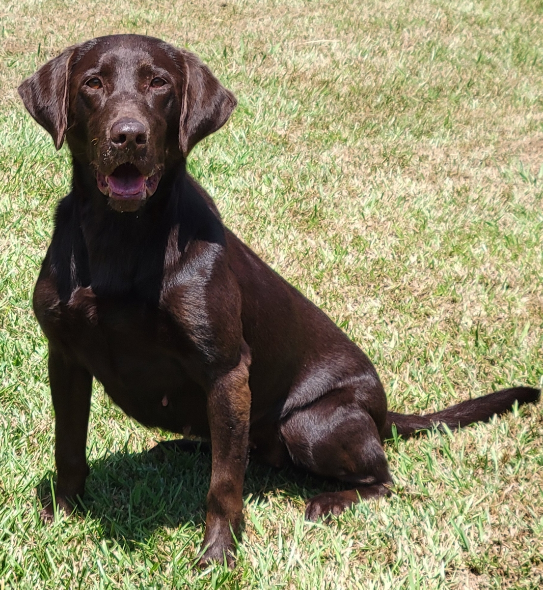 Magic is a beautiful dark chocolate color with an incredible strong retrieving drive. She is out of accomplished Hunt Test Pedigree. She has the nessary healthy clearances and is a good mother to beautiful puppies.