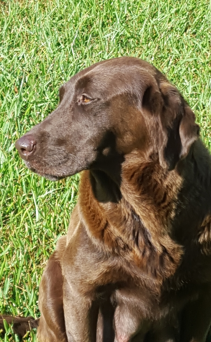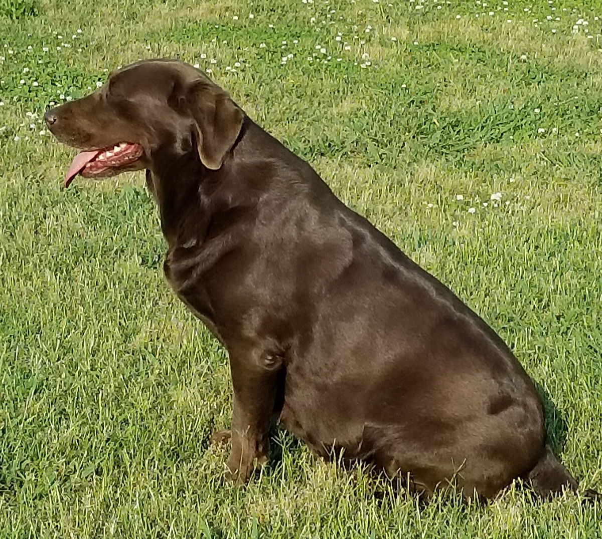 Lucy is the Daughter of FC AFC Its All Over Now Baby Blue, Granddaughter of FC AFC Tiger McBunn and FC AFC Gator Pts Sweet Potato Pie. She is a beautiful chocolate with great body conformation and very nice head. Very loyal and pleasing personality.