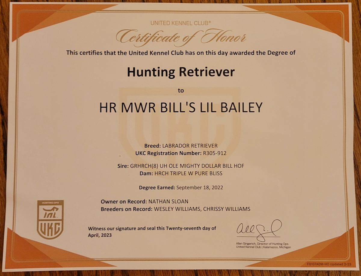 Bailey has a great loyal personality. She is energetic and has a natural retrieving instict. She earned her HR title September 18, 2022. Bailey is the daughter of 8xGRHRCH UH Mighty Dollar Bill HOF. Her offspring should make great competition/hunting or family companions