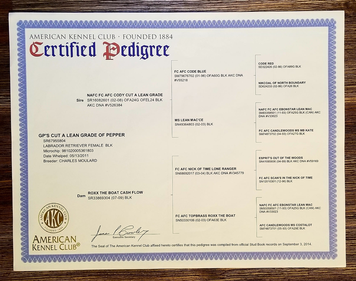 Peppers pedigree is in our website under her name in the Adults page. Www.southernflightretrievers.com