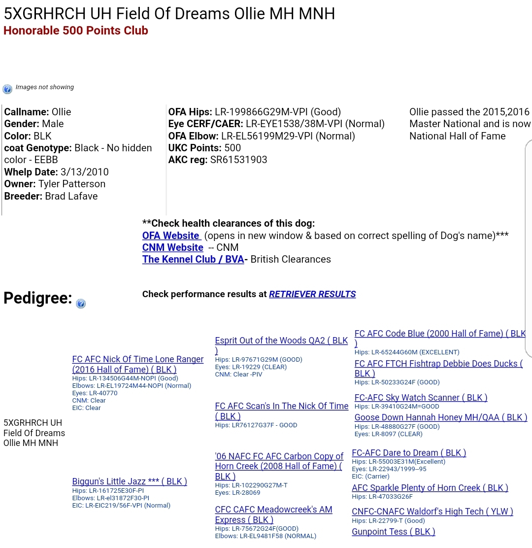 Sire: 5xGRHRCH UH Field of Dreams Ollie MH MNH