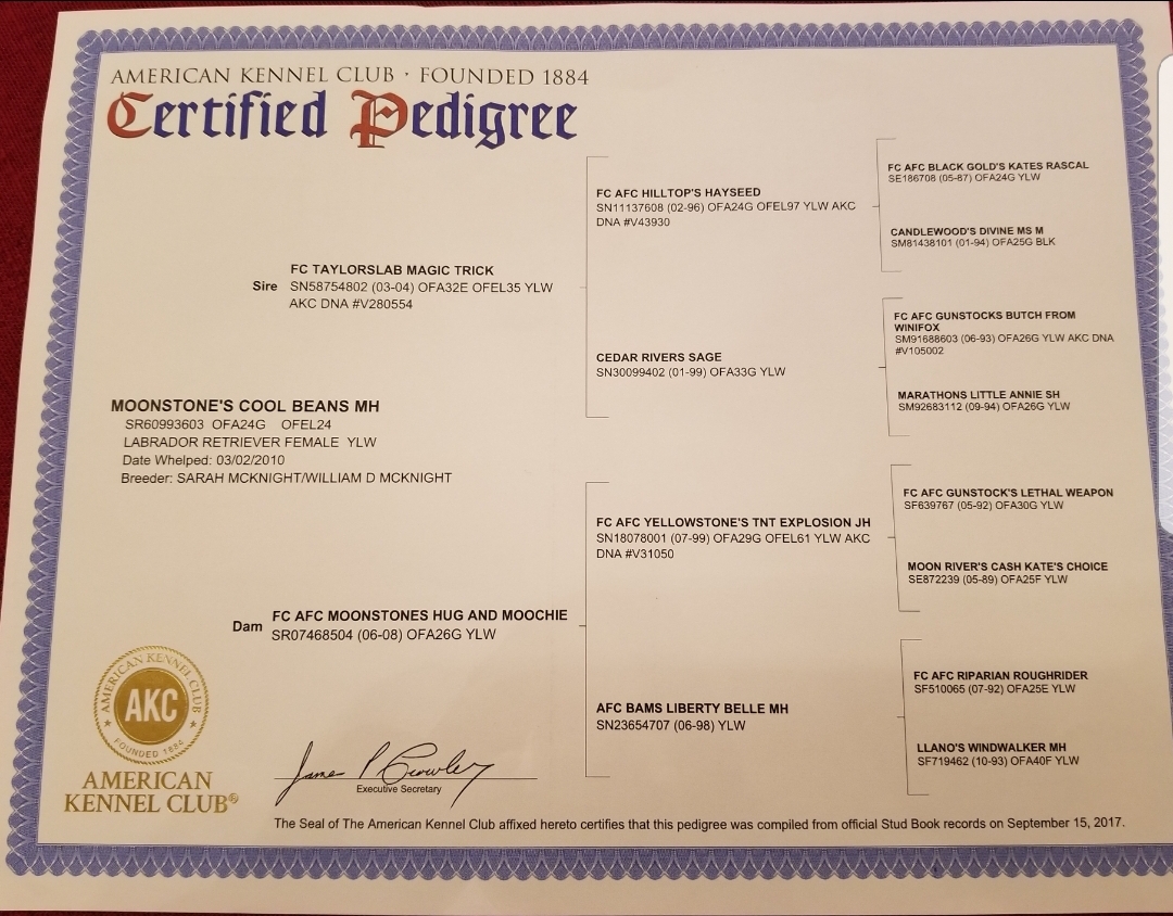 Beans has earned her Master Hunter title. Has a very stacked field trial pedigree. Lots of good old names. Her Sire is FC Taylorlab Magic Trick Dam is FC AFC Moonstones Hug and Moochie Beans has friendly nice personality. Excellent mother!