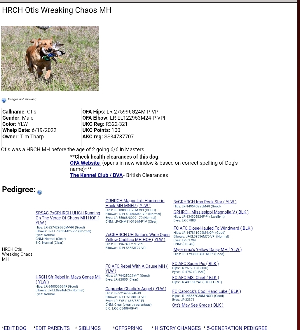 Sire: HRCH Otis MH (son of SRSAC 6xGRHRCH UH Chaos MH Hall of Fame and HRCH Maya MH - Rebel in Maya Genes)
